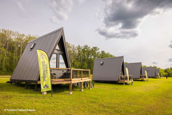 Bei einem Besuch von Beardy's & Okemasis' Cree Nation in Pêmiska können Gäste die Kultur und Gastfreundschaft der Cree erleben. Die brandneuen Tipi-Lodges im Fort Carlton Provincial Park im Herzen des Treaty 6 sind mit ihrem Tipi-Look eine Hommage an die indigene Vergangenheit. Sie sind mit fließendem Wasser und Sanitäranlagen ausgestattet, eine Shower Lodge mit Duschen soll in Kürze eröffnet werden. Jede Lodge bietet Platz für bis zu 5 Personen und verfügt über ein Doppelbett, ein ausziehbares Bett und ein weiteres Bett im Loft. Weitere Ausstattungsmerkmale sind: