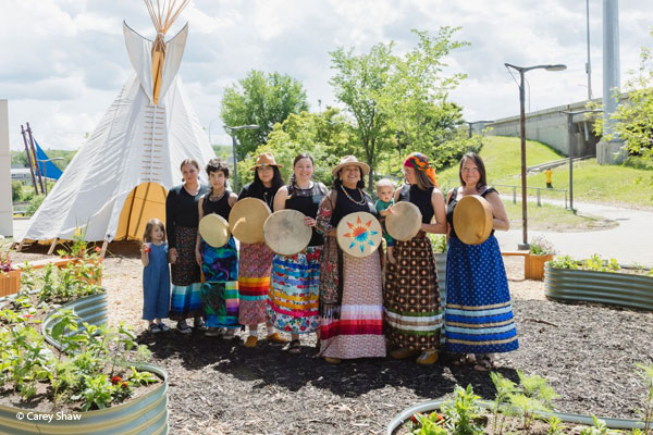 Ein neuer Bereich in Remai Modern ist der indigene Medizinrad-Garten Maskihkiy Kiskinohamâkewin, in dem traditionelles, indigenes Wissen an die nächste Generation weitergegeben wird. Das Medizinrad besteht aus vier Quadranten, die die vier Himmelsrichtungen darstellen und die vier heiligen Heilmittel enthalten: Tabak, Zedernholz, Salbei und Süßgras. Diese Heilmittel spielen eine wichtige Rolle bei spirituellen Praktiken, die bei traditionellen Heilungen und Zeremonien eingesetzt werden. Kamisha Alexson, die Leiterin der indigenen Programme von Remai Modern, hatte sich mit Ältesten und anderen indigenen Gemeindemitgliedern beraten, um ein bedeutungsvolles Instrumentarium zur Unterstützung der Entkolonialisierung städtischer Räume zu schaffen. Dieser Garten soll ein sicherer Ort sein, an dem man sich inmitten der Heilmittel niederlassen kann, um seine Beziehung zum Land wiederherzustellen.