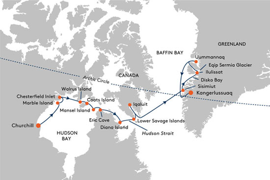 Das Abenteuer beginnt mit einem Charterflug nach Churchill, an der Küste der Hudson Bay im Norden Manitobas. Die HANSEATIC nature liegt zunächst zwei Tage lang vor Churchill, bevor sie sich auf eine spannende Fahrt durch die Hudson Bay, die Hudson Strait und die Frobisher Bay begibt, um schließlich ihr Ziel auf Grönland zu erreichen.