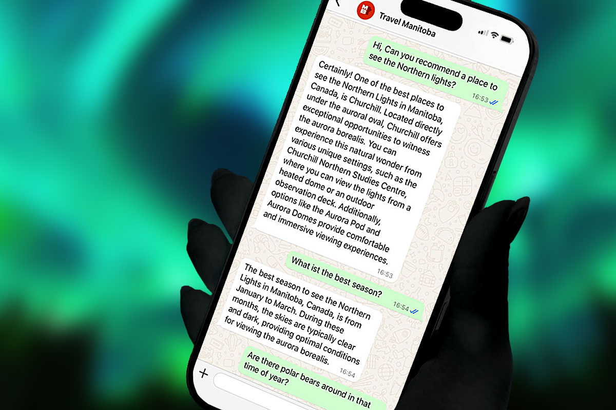Du hast eine Frage zur Destination Manitoba, aber kein fachkundiger Kollege ist erreichbar? Travel Manitobas neuer KI-Assistent scannt täglich unsere Website nach (neuen) Informationen und bietet Online-Reiseberatung in über 40 Sprachen, und das 24/7! Er ist per Web-Chat auf www.travelmanitoba.com sowie über Meta und WhatsApp verfügbar.