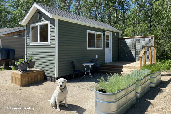 Neu ist nun die PerLODGE, eine kleine, gemütliche Unterkunft auf Melanies Grundstück, eingebettet in einen Wald aus Espen und Eichen ein idealer Ort für ein ruhiges Wochenende in der Natur. Das Tiny House hat Platz für bis zu zwei Personen. Begrüßt werden die Gäste mit einem liebevoll zusammengestellten Willkommenspaket mit Stofftasche, einem Glas lokaler Marmelade, Bannock, einem Stick-Set von Borealis Beading und so manchem mehr.