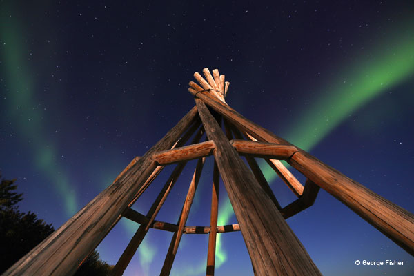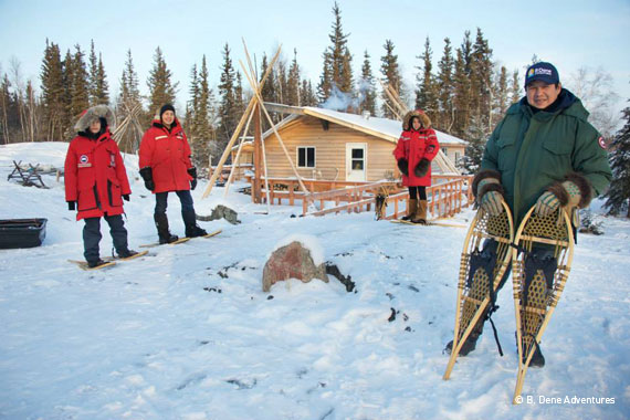 Das traditionelle Dene Culture Camp von B. Dene Adventures liegt an der Akaitcho Bay am Ufer des Great Slave Lake und vermittelt die Lebensweise der Dene durch Geschichte, Sprache und eine einzigartige Verbindung zum Land. Es ist zu 100 % in indigenem Besitz und wird von Indigenen betrieben. Das Camp liegt etwas außerhalb von Dettah, auf der anderen Seite der Bucht von Yellowknife, und bietet einige der besten Aurora-Beobachtungsmöglichkeiten. Gäste entspannen sich in der warmen Hütte oder im Tipi, genießen kulturelle Geschichten, traditionelles Wissen oder Mitmach-Aktionen und lernen dabei die Yellowknives Dene kennen, die in diesem Land beheimatet sind. Die Programme werden das ganze Jahr über angeboten.