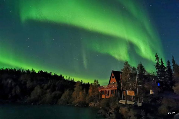 Beste Möglichkeiten zur Beobachtung der Polarlichter bietet auch die Yellow Dog Lodge. Diese komfortable Wildnis-Lodge liegt nur 15 Flugminuten nordöstlich von Yellowknife in traumhafter Lage direkt am Ufer des Graham Lake. Ihre Besitzer, Kathy und Gord Gin, führen die Lodge in der herzlichen Art, die so typisch ist für die Menschen des Nordens. Den Gästen stehen gemütliche Zimmer in der Main Lodge oder private Cabins mit eigenem Kaminofen zur Verfügung. Im Sommer gibt es darüber hinaus rustikale Glamping-Zelte auf dem Schwimmdock. Je nach Jahreszeit, können sich die Gäste die Zeit mit Angeln, Wandern, Kanufahren, Eisangeln, Langlauf, Schneeschuhwandern oder Schneemobil-Fahren vertreiben.
